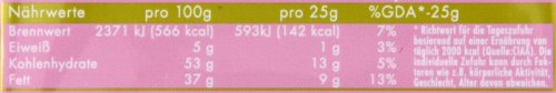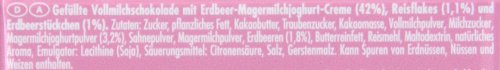 Suiker, palmvet, cacaoboter, dextrose, cacaomassa, volle melkpoeder, melksuiker, magere melk yoghurt poeder, roompoeder, magere melkpoeder, aardbeien, geklaarde boter, rijst, maltodextrine, natuurlijk aroma (melk), emulgator: lecithine (soja), voedingszuur: citroenzuur; zout, gerstemout (gluten). Kan sporen van Gluten, Eieren, Pinda,Soja, Melk en Noten bevatten