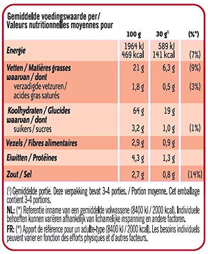 Ingrediënten: aardappelpoeder, aardappelzetmeel, zonnebloemolie, rijstebloem, hartige smaak [LACTOSE (van MELK), weipoeder (van MELK), suiker, smaakversterkers (mononatriumglutamaat, dinatriumguanylaat, dinatriuminosinaat), aroma’s (bevat KAASPOEDER en BOTER (van MELK)), voedingszuur (citroenzuur), kaliumchloride], zout, emulgator (lecithine (bevat SOJA, MELKEIWIT)), kleurstoffen (curcumine, karmijn, annatto bixin, paprika-extract), specerijen.
