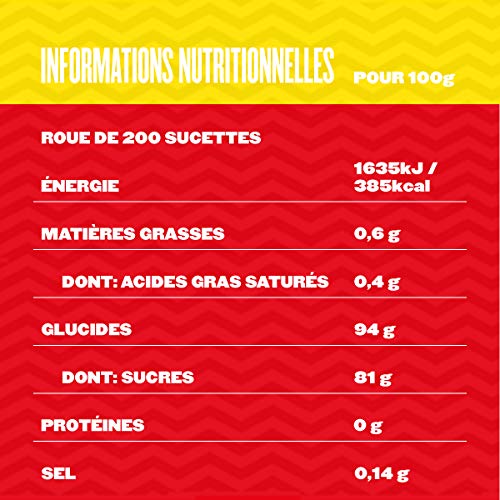 Ingrediënten: (voor de smaken aardbei, kersen en appel): suiker, glucosestroop, vruchtenpuree (3%) (appel, kers, framboos, ananas, limoen, citroen, aardbei, perzik, banaan, sinaasappel, bosbes, braam, mango, watermeloen en kiwi), voedingszuren (melkzuur, appelzuur, citroenzuur), aroma’s, kleurstoffen (E100, E162)., Ingrediënten (voor de smaak cola): suiker, glucosestroop, voedingszuren (melkzuur, appelzuur, citroenzuur), aroma’s, kleurstof (E150d)., Ingrediënten (voor de smaken aardbei-room en framboos-vanille): suiker, glucosestroop, weipoeder, vruchtenpuree (3%) (appel, kers, framboos, ananas, limoen, citroen, aardbei, perzik, banaan, sinaasappel, bosbes, braam, mango, watermeloen en kiwi), volle melkpoeder (1,6%), voedingszuren (melkzuur, appelzuur, citroenzuur), cacaoboter, aroma’s, kleurstoffen (E100, E162, E163).