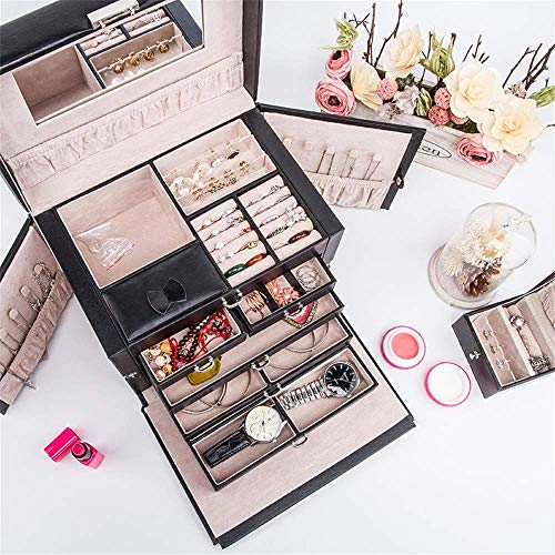 Spacious room : 2 side doors for necklace, 5 slide out drawers, 20 compartments,10 necklace hooks, 3 large storage pouches, 2 removable earring holders which hold up to 30 earrings.