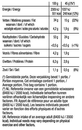 Ingrediënten: aardappelen, plantaardige oliën (zonnebloem, koolzaad, maïs, in wisselende hoeveelheden), zout.