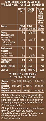 Ingrediënten: volkoren HAVERMOUT (37%), pure chocolade*** (12%) [cacaomassa, suiker, natuurlijke vanille aroma, emulgator (sojalecithine, polyglycerol, polyricinoleaat)], zonnebloemolie, suiker, volkoren tarwe (9,6%), glucosestroop, oligofructose (chicoreiwortel-extract), rijstebloem (2,1%), TARWEBLOEM (1,9%), kokosnoot, melasse, zout, kaneel, gekarameliseerde suiker, aroma’s, antioxidant (tocopherol). ***Chocolade bevat tenminste 65% cacaobestanddelen. Dit product kan sporen van melkpoeder bevatten en is geproduceerd op een productielijn waarop verschillende soorten noten worden verwerkt.