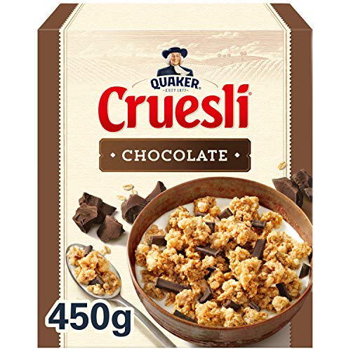 Quaker Cruesli Chocolade is een knapperige granenmix met goudbruin geroosterde volkoren havermout en heerlijke stukjes chocolade