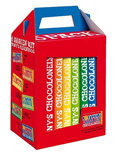 Deze verpakking bevat 6 verschillende Tony’s Chocolonley chocoladerepen van 180 gram